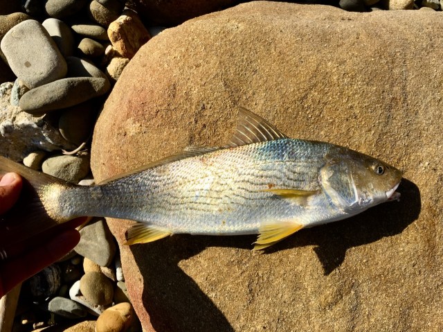 I fished for two hours in the morning throwing lures from the beach at high tide. A week earlier I didn’t get a single bite. This time I hooked something small on my first cast, but it got off. Probably a small perch. Maybe a yellowfin croaker.